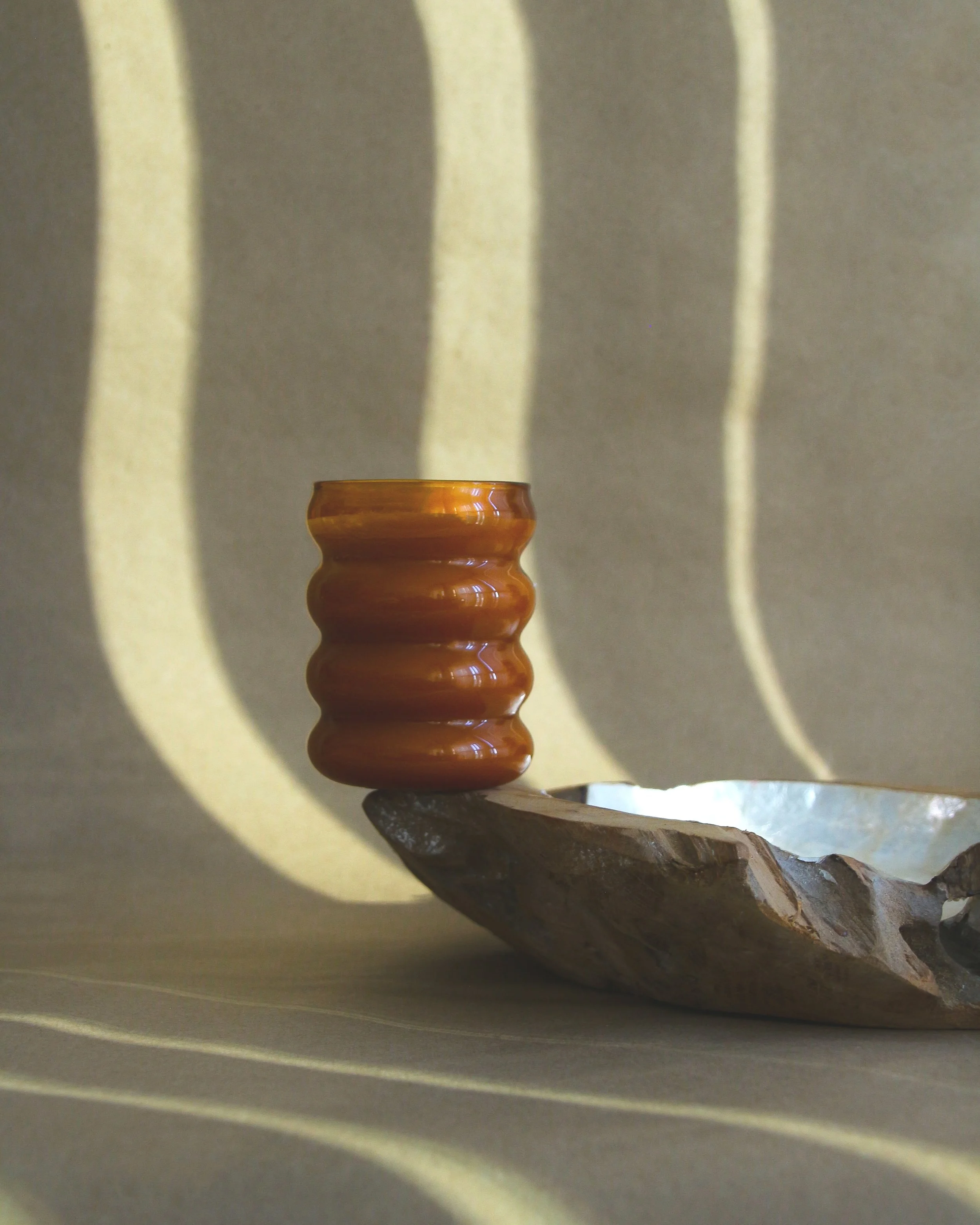 Fresh baked bread candle in handblown rippled reusable glassware and recyclable packaging. Wax is made from renewable resources. 8 oz.